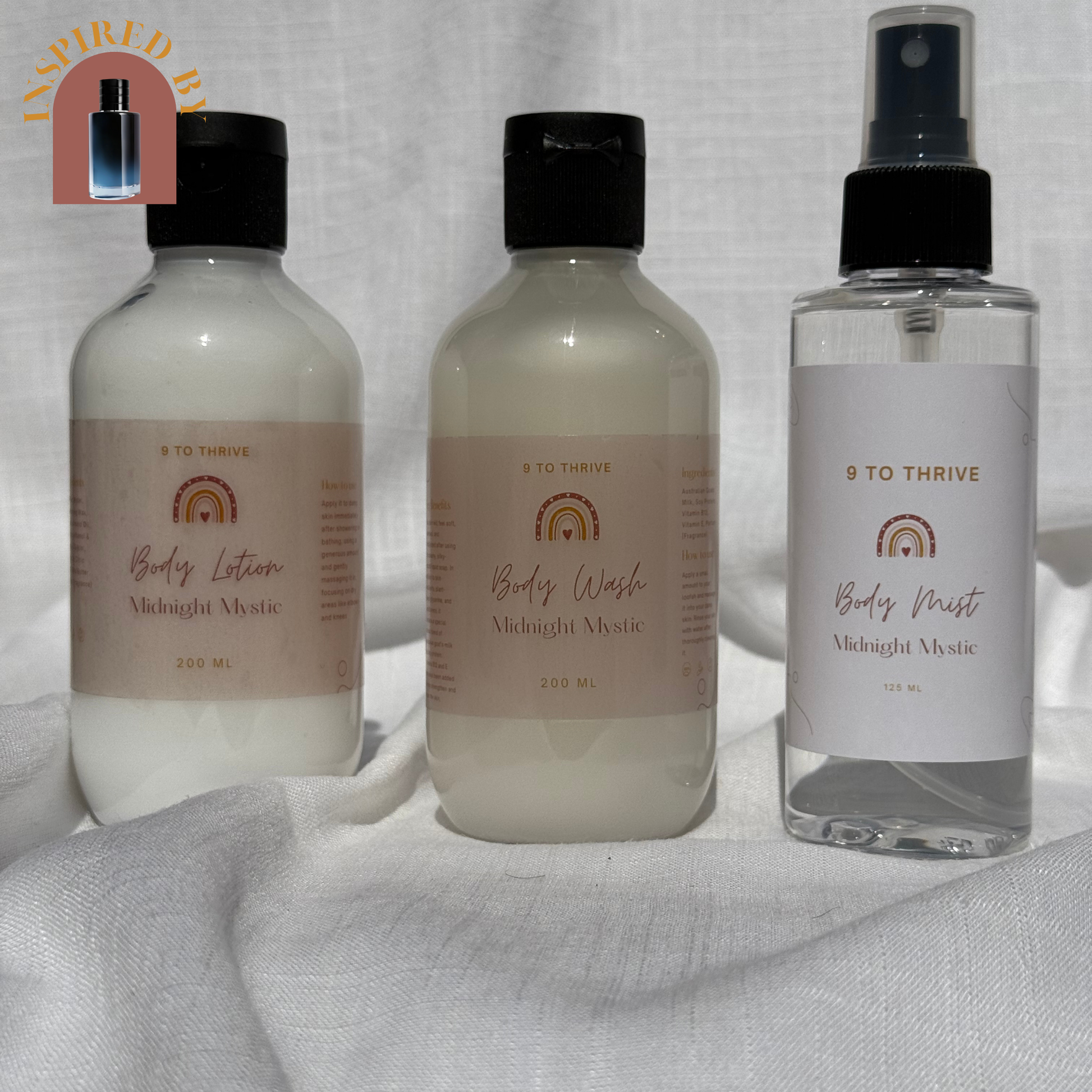 Introducing the Midnight Mystic Trio - the ultimate pampering set for your body! This trio includes a luxurious body wash, a hydrating body lotion, and a refreshing body mist, all infused with the enchanting scent of the midnight mystic.